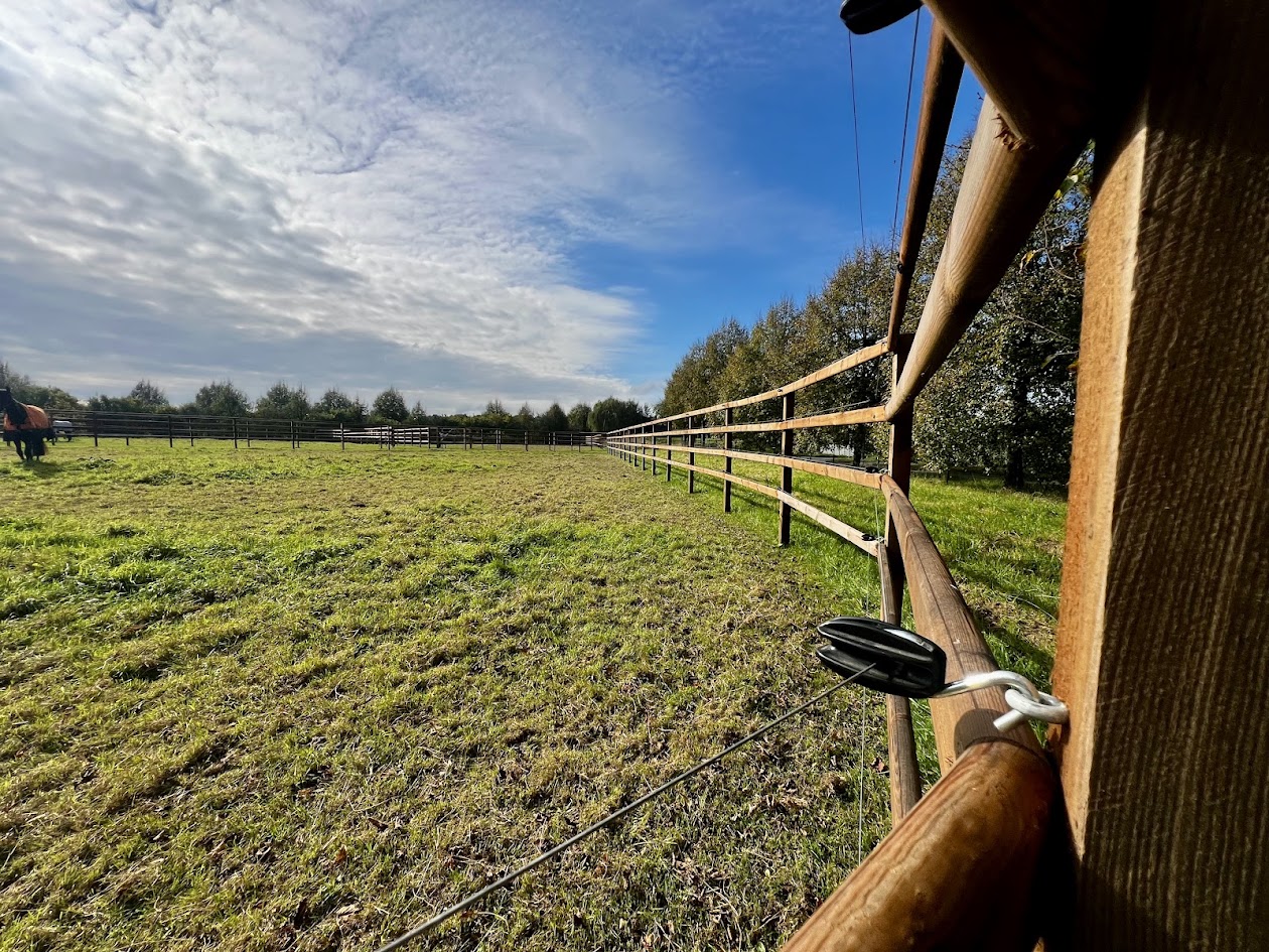 Een goede paardenomheining moet veilig, stevig en duidelijk herkenbaar zijn voor het paard. In deze uitvoering werken we met een dikke, gladde permanentkabel van 8 mm. Door de goede geleiding ontstaat er een spanningsveld om de kabel heen. Paarden voelen dit aan, waardoor ze meer afstand houden tot de omheining. Dat vergroot de werking en betrouwbaarheid in de praktijk.